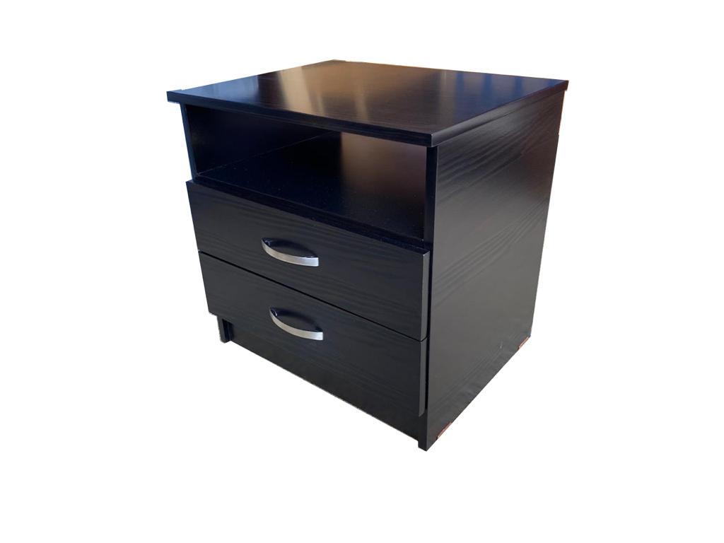 Mesa de noche fabricada en MDF, sus medidas son 50 cm de ancho por 40 cm de fondo y 50 cm de altura. Cuenta con dos cajones que incluyen correderas metálicas.